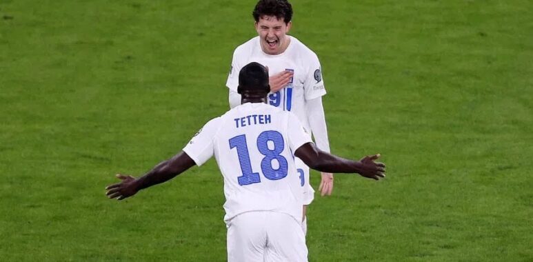 “Ο Ανδρέας Τεττέη, που γεννήθηκε και μεγάλωσε στην Ελλάδα από γονείς με καταγωγή από τη Γκάνα, δίνει την ασίστ στον Κωνσταντίνο Καρέτσα, που γεννήθηκε και μεγάλωσε στο Βέλγιο από Έλληνες γονείς.
