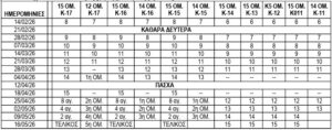 ΑνακοινώσειςΤελευταία Νέα Υποδομές: Ημερομηνίες και αγωνιστικές ως το τέλος 13 Φεβρουαρίου 2026 Στον παρακάτω πίνακα θα βρούμε τις ημερομηνίες στις οποίες υπάρχουν προγραμματισμένοι αγώνες και όλες οι αγωνιστικές έως το τέλος των πρωταθλημάτων υποδομών της Ένωσης Ποδοσφαιρικών Σωματείων Αθηνών.