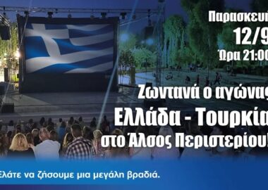 Ο Δήμος Περιστερίου μας προσκαλεί όλους την Παρασκευή 12 Σεπτεμβρίου 2025 και ώρα 21:00, να παρακολουθήσουμε όλοι μαζί τον μεγάλο ημιτελικό του Eurobasket: Ελλάδα...